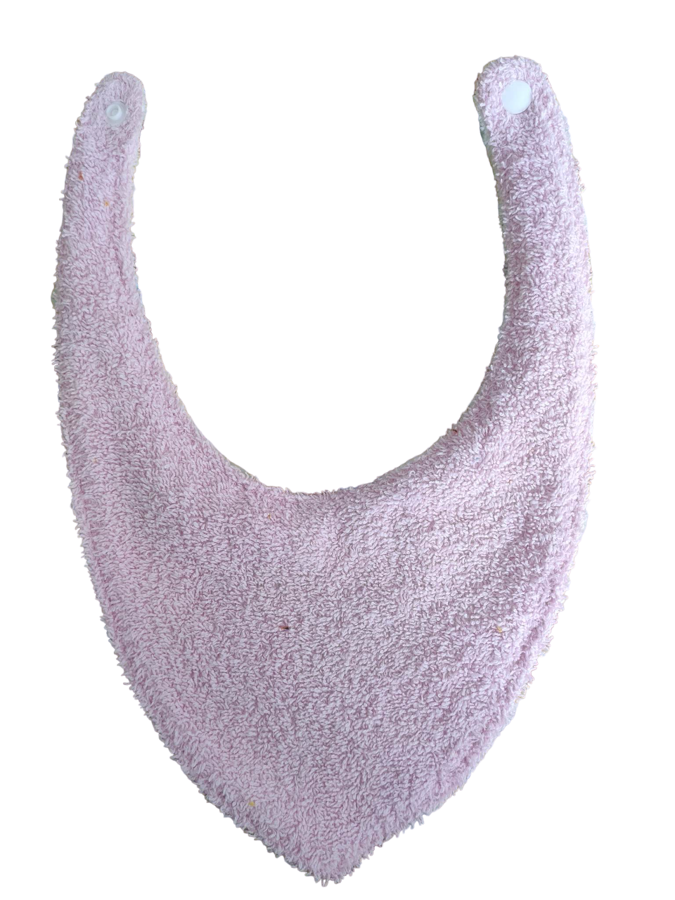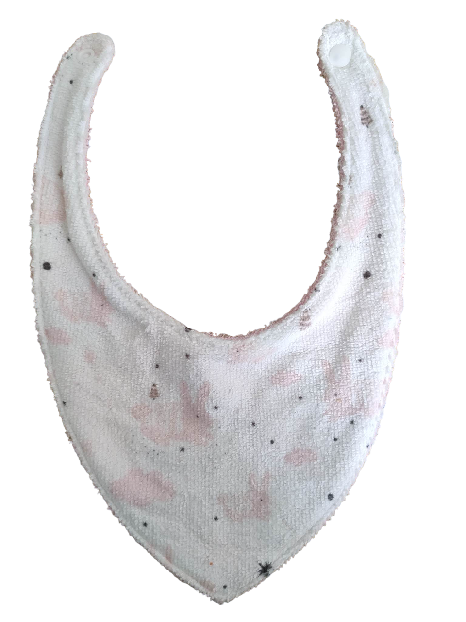 Bavoir sur le thème "lapins". Il est de couleur blanc et rose clair. Les motifs représentent des lapins.